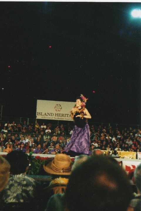 主宰の酒井 信代先生は、2004年3月に東京で開かれた「第2回ジャパン・カウアイ・モキハナ・フェスティバル」において、古典・現代フラの両部門で優勝し、そして同年4月ハワイ島ヒロで開催される第41回メリーモナークフェスティバル前夜祭において日本人として名誉あるソロ出演を果たしました。この写真は、その受賞曲”hanohano no kalihi! アウアナをソロで踊ったときの信代先生です。とても輝いて希望に満ちています。会場からは、日本人のソロということで大歓声をもらい、翌日のハワイ新聞にもこの写真が載り、紹介されました。